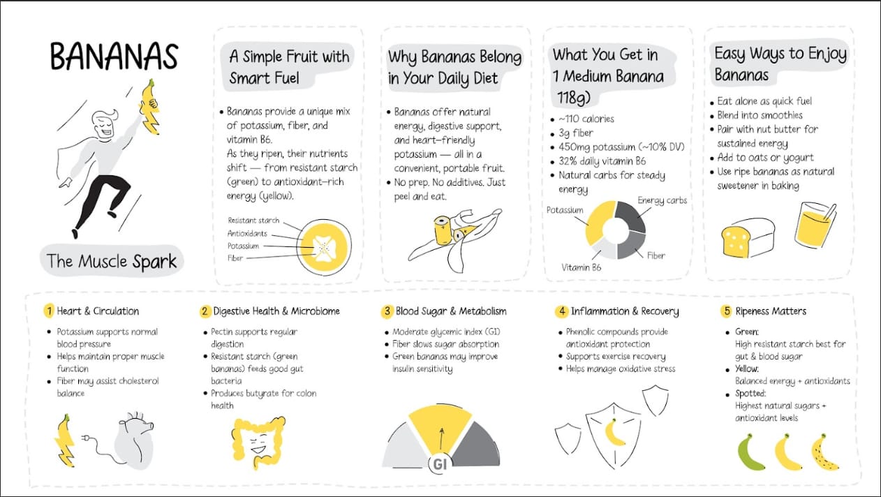 Cardiovascular Support: Properly highlights that the high-potassium to low-sodium ratio in bananas functions as a natural vasodilator, which is clinically relevant for blood pressure management.