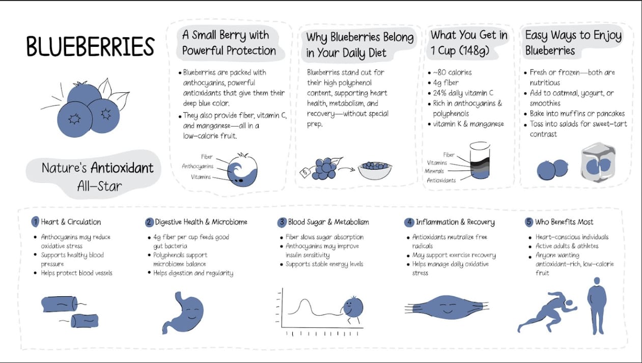• Clear summary that blueberries are rich in anthocyanins (a class of polyphenols that give the blue color) plus fiber, vitamin C, vitamin K, and manganese. • Evidence is strongest for modest cardiovascular support (e.g., small improvements in blood pressure and vascular function) when ~½–1 cup is eaten regularly as part of an overall healthy pattern. • The nutrition snapshot (about 80 kcal and ~4 g fiber per cup) and practical ideas for using fresh or frozen berries are accurate and useful. • Noting that dried and extract forms can be more sugar‑dense or lack fiber is a helpful distinction.
